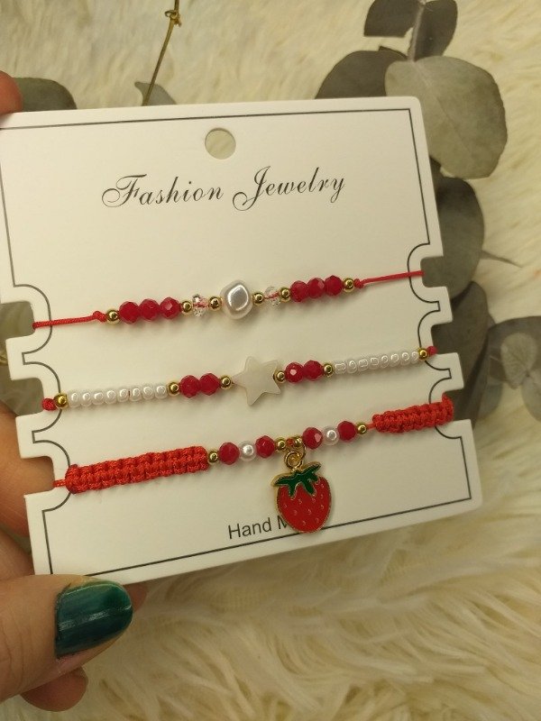 AQP0090 Set 3 Pulseras Hilo Bijouterie Frutilla esmaltada